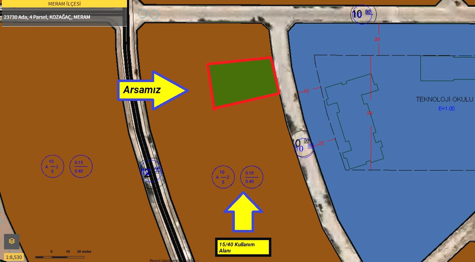 Not: Bahçe içindeki evimiz yıkılıp tekrar bir bina yapılması düşünülürse; 0.15/0.40 olması sebebiyle; zeminde 150 M2 net, toplamda 400 M2 inşaat alanı bulunmaktadır. Ayrıca, bahçe içindeki binamız “İmar Barışından Ruhsatlı”dır!